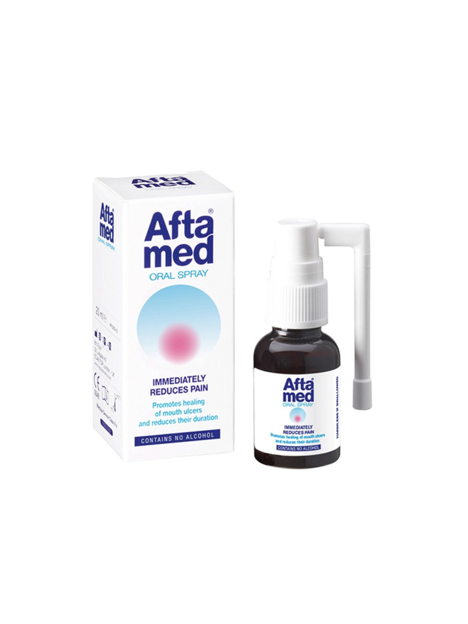 Το Aftamed Oral Spray είναι ένα καινοτόμο προϊόν που βοηθά στην άμεση ανακούφιση από τον πόνο που προκαλείται από στοματικά έλκη, αφθώδη στοματίτιδα, τραυματισμούς από σιδεράκια ή τεχνητές οδοντοστοιχίες.