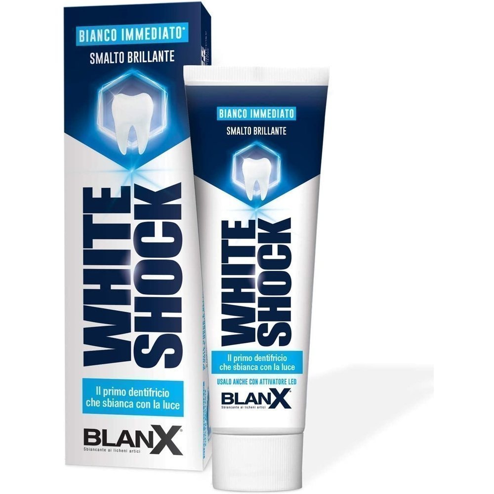 Το BlanX White Shock Instant White είναι η μόνη οδοντόκρεμα με διπλή κατοχυρωμένη καινοτομία, ActiluX, που λευκαίνει με φως. Τώρα με μπλε φόρμουλα για άμεσο λεύκανση. Για καθημερινή χρήση το ActiluX εναποτίθεται στα δόντια και παραμένει ενεργό όλη την ημέρα. Δίνει ένα φυσικό, λευκό χαμόγελο χάρη στην ελαφριά δράση. Η αντιβακτηριακή δράση απομακρύνει αποτελεσματικά τα βακτήρια που προκαλούν πλάκα και κοιλότητες Ορατό αποτέλεσμα από την πρώτη χρήση χάρη στο Blue Formula Peroxide, χωρίς λειαντικό και ασφαλές σμάλτο Βούρτσα καλά για 2 λεπτά, δύο φορές το ημέρα.